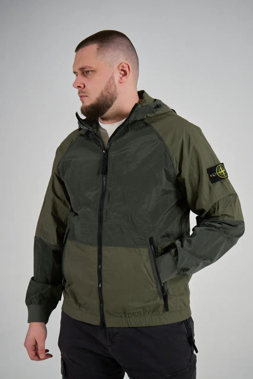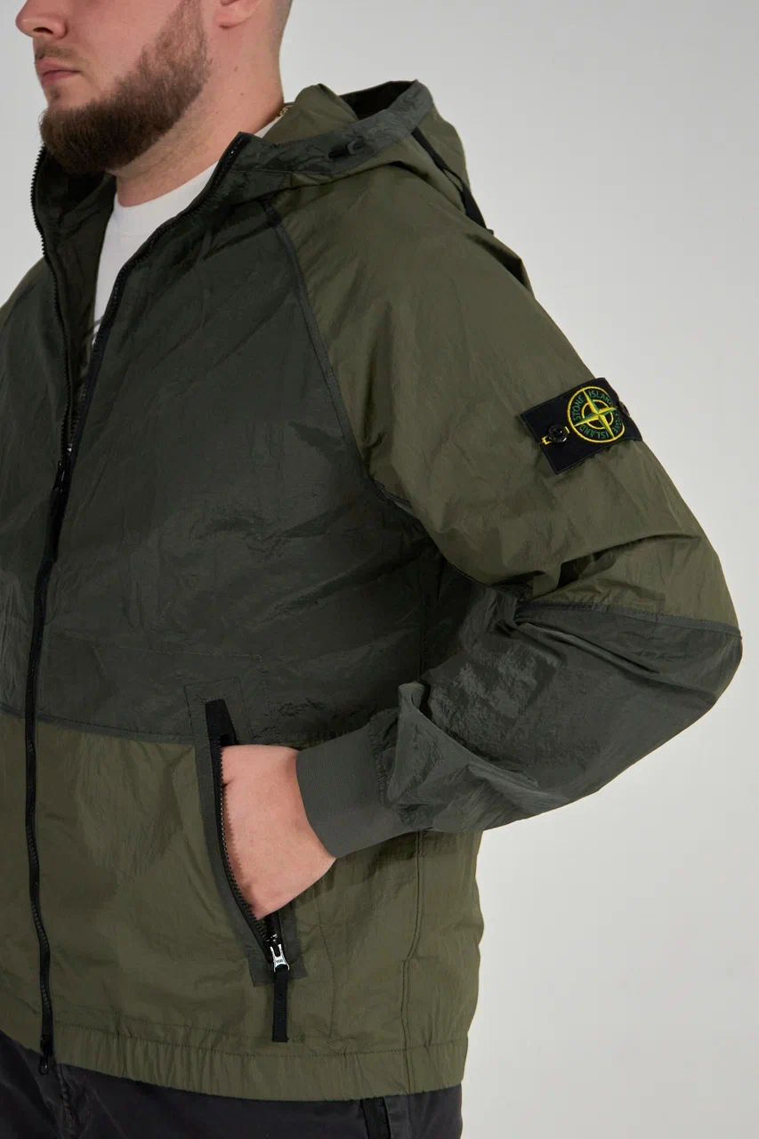 Куртка с капюшоном из ткани с переливающимся эффектом Nylon Metal. Ткань обработана смолой изнутри для легкой водо- и ветроустойчивости. Затем готовое изделие проходит сложную процедуру двойного окрашивания. Эластичный контурный шнурок на капюшоне и боковые ремни с пряжками. Рукава реглан и горизонтальный шов на талии отделаны плоской нейлоновой аппликацией. Слегка скошенные карманы для рук с застежкой-молнией. Значок Stone Island на левом рукаве. Ребристые манжеты. Эластичный нижний край. Двусторонняя застежка-молния.
