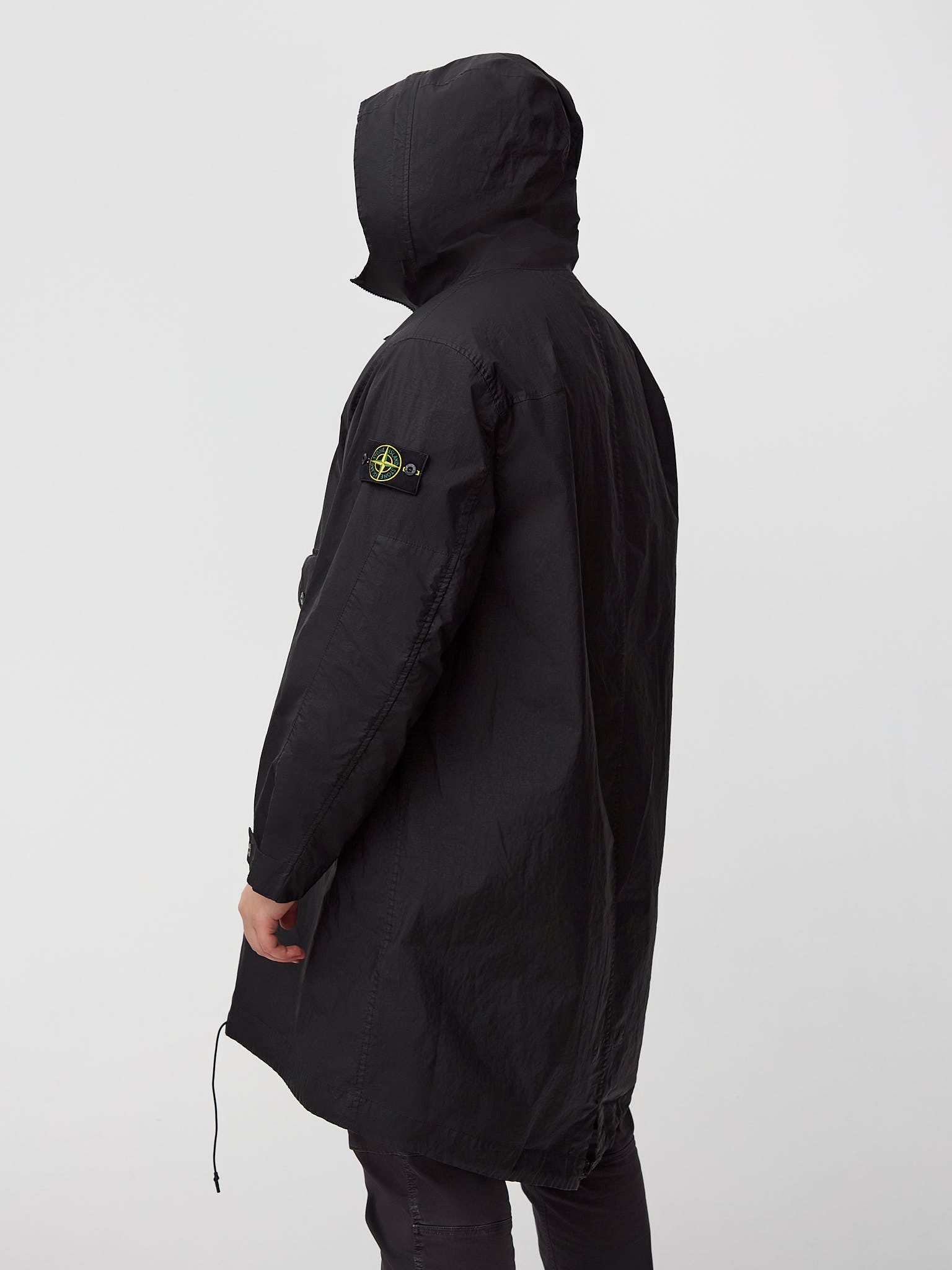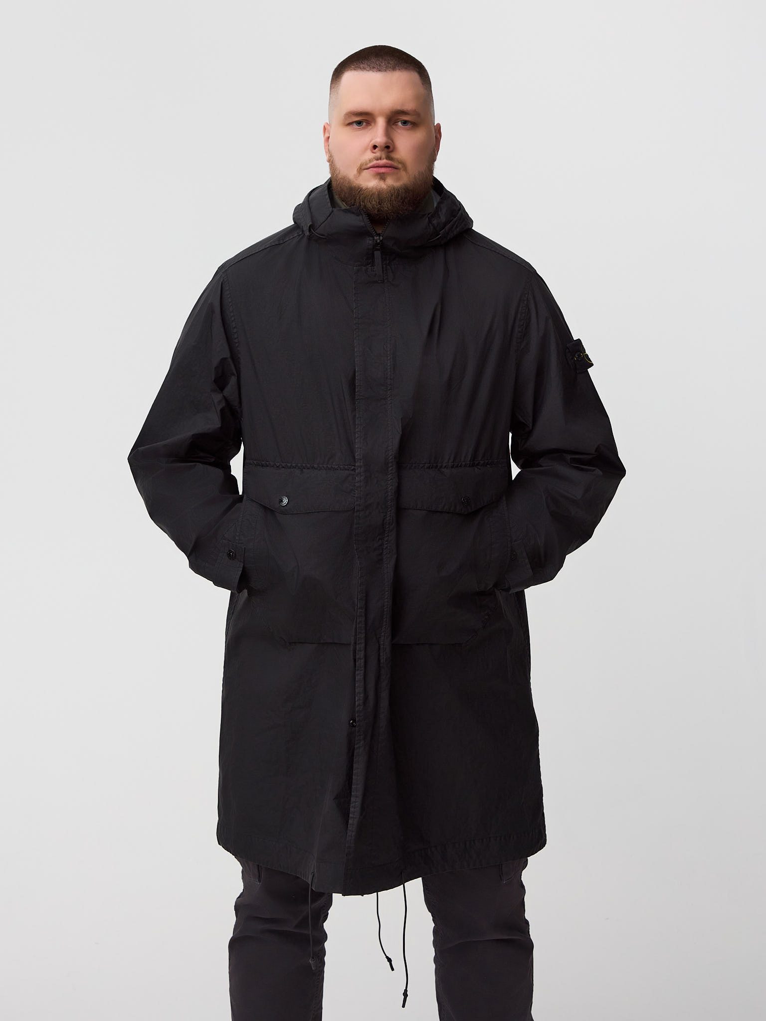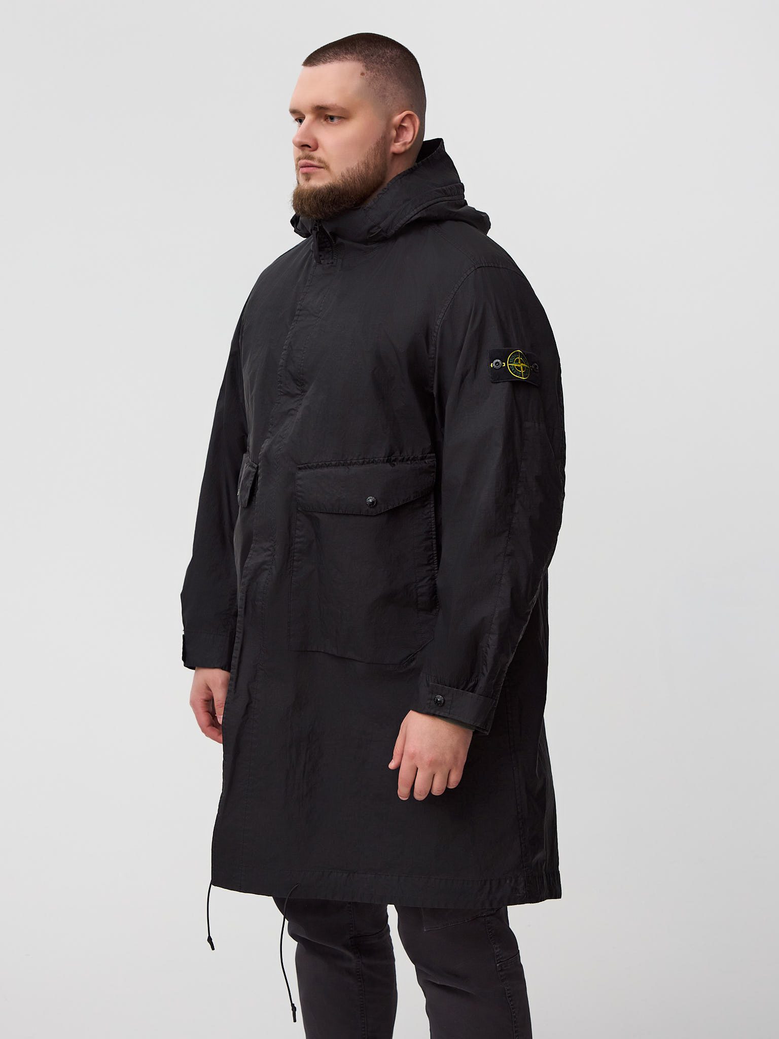 Плащ дополнен функциональными карманами, надёжной двухсторонней молнией, регулируемыми элементами и культовым патчем Stone Island на рукаве. Лёгкий вес, практичность и минималистичный дизайн делают модель универсальным решением для повседневного городского гардероба и межсезонья.