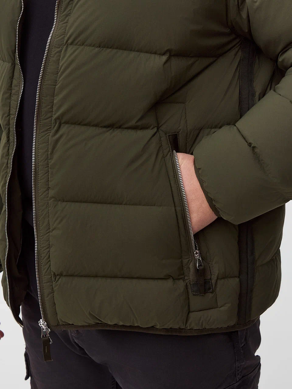 Внутренние камеры наполняются пухом и пером методом прямой инжекции (примерно 90% пух / 10% перо), что обеспечивает лёгкость, высокий уровень теплоизоляции и равномерное распределение наполнителя. Используемый пух сертифицирован по стандарту RDS (Responsible Down Standard), подтверждающему ответственное происхождение материала.