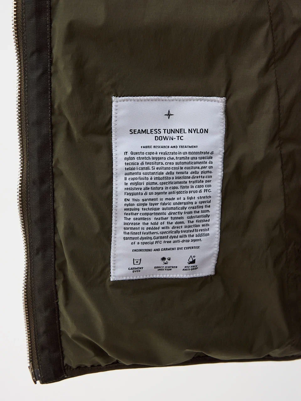 Пуховик Stone Island Seamless Tunnel Nylon Down-TC — технологичная модель, созданная на основе инновационных разработок бренда в области материалов и конструкции. Куртка выполнена из лёгкого эластичного нейлона, произведённого по специальной технологии плетения, при которой каналы для пуха формируются непосредственно в процессе ткачества, без традиционных швов. Такая конструкция улучшает удержание утеплителя и повышает долговечность изделия.